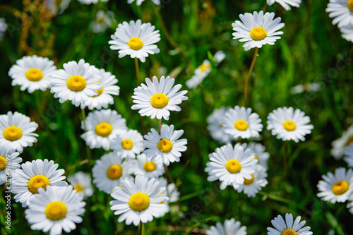 Chamomile flower field. Camomile in the nature. Field of camomiles at sunny day at nature. Camomile daisy flowers in spring day. Chamomile flowers field wide background in sun light