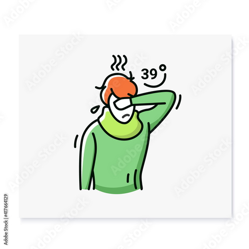 Character has a high temperature color icon.Person goes hot.High body temperature.39 C.Symptom virus, cold, flu.Isolated vector illustration