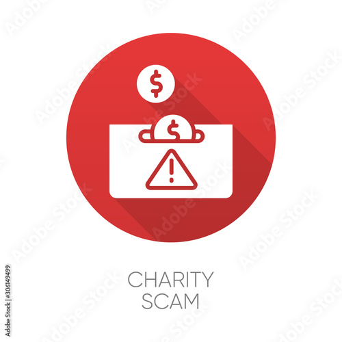 Charity scam red flat design long shadow glyph icon. Sham charity. Fake donation request. False fundraiser. Money theft. Online fraud. Cybercrime. Fraudulent scheme. Vector silhouette illustration