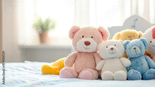 stuffed animal, plush toy, bear, pink, white, colourful, bed, cosy, arrangement, playful, soft, childhood, decor, home, interior, cute, comfort, toy, bedchamber, cuddly, happiness, relaxation, family, children, childcare center, soft toy, fabric, smiling, cheerful, indoor