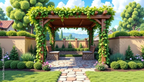 charming backyard pergola in an illustrative style, using oak and vine palette, gentle curves, textured leaves, calm atmosphere, high resolution