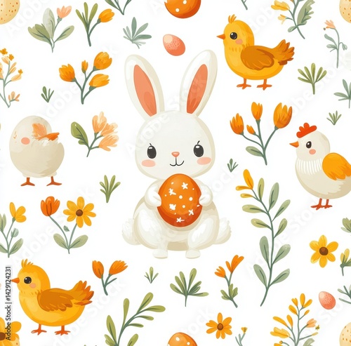 easter, rabbit, chick, seamless pattern, spring, flower, egg, rabbit, celebration, cartoon, cute, festive, nature, animal, illustration, joyful, cheerful, design, wallpaper, holiday, decoration, graphic, creative, happy, playful, pattern, springtime, gardening, lovely, seasonal, illustration, fun, children, family, egg hunt, whimsical