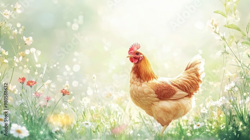Charming Chicken in a Flower Field Under Soft Light