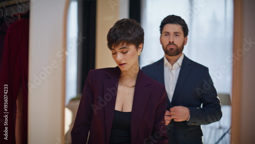 Charming couple looking mirror reflection closeup. Elegant pair trying blazers