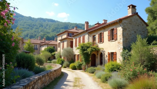 mountain, village, quaint, architecture, building, sky, path, tree, garden, rustic, cloud, stone, blue, flower, sunlight, picturesque, shrub, peaceful, serene, landscape