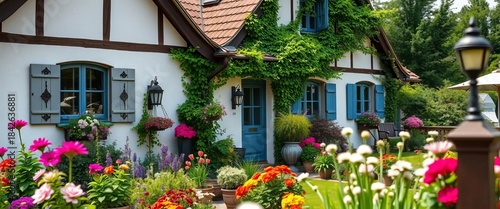 picture, landscaping, building, residential, rural, flower, spring, nature, terrace, scene, idylli, colours, bungalow, summer, facades, plant, property, image, path, roof, green, countryside, home, floral, dwelling, architecture, real estate, photo, view, german, bloom, stone, tranquil, peaceful, brick, garden, house, window, vibrant, door
