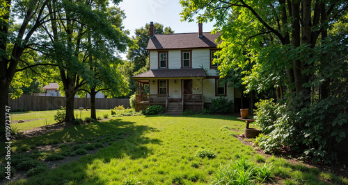 house, garden, greenery, sunlight, architecture, landscape, residential, tree, lawn, plant, nature, charming, serene, peaceful, home, backyard, environment, bright, summer, relaxing, garden design, calmness, beauty, foliage, suburban, scenic, vibrant, lawncare, landscaping, inviting, cosy, structure, rural, space, architectural, harmony, living, aesthetic, comfort