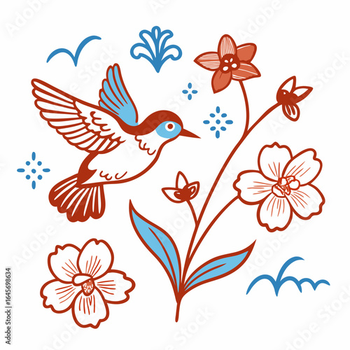 hummingbird, bird, flying, flower, floral, nature, wildlife, illustration, drawing, vector, folk, art, traditional, decorative, ornamental, design, pattern, stylised, simple, clean, minimalist, graphic, artistic, creative, whimsical, charming, cute, sweet, spring, summer, garden, blossom, flower petals, leaf, blue, red, white, background, isolated, hand, drawn, outline, motif, element, symbol