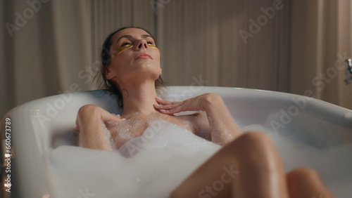 patch, woman, hygiene, spa, foam, bathtub, skincare, home, bathroom, relax, evening, closeup, candle, care, skin, water, treatment, beauty, chilling, resting, night, cosmetic, pampering, wellness, washing, charming, lovely, romantic, sauna, bathe, luxury, carefree, laying, bubble, enjoying, body, grooming, alone, lady, girl, model, house, sensual, slow motion, closeup