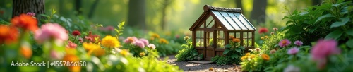 Charming miniature greenhouse nestled in vibrant garden , summer, herbs