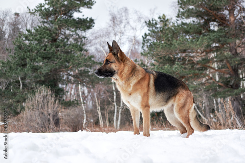Charming purebred dog on background of green coniferous trees, horizontal picture. Beautiful young girl dog breed German Shepherd black and red color stands in winter snow forest and poses.