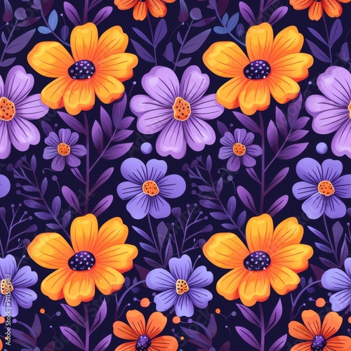 wildflower, seamless pattern, floral pattern, purple flower, orange flower, dark background, fabric design, summer flowers, high fidelity