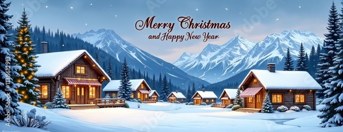 Charming Snowy Mountain Village with Cozy Wooden Cottages at Twilight