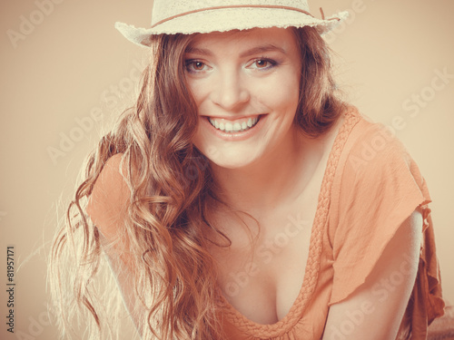 fashion, fashionable, wear, outfit, attractive, beauty, clothes, clothing, girl, happiness, hat, holiday, relax, resort, straw, summer, holiday maker, vacation, woman, hair, wavy, curly, make-up, smile, positive, content, lovely, cute, joy, joyful, blissful, charming, laughing, winking, blink, closeup