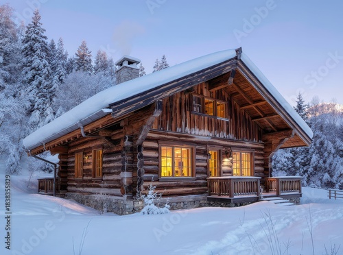 Charming Wooden Cabin Surrounded by Snowy Forest Landscape at Dusk