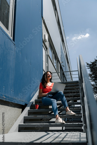 Charming young woman with laptop sitting on stairs