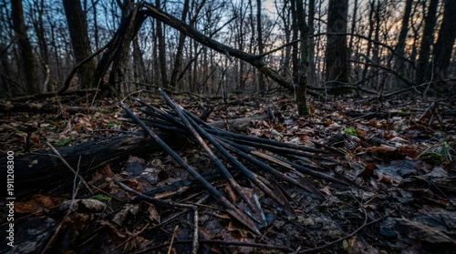 Charred Wooden Sticks Pile in Autumn Forest