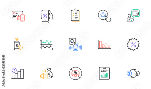 Checklist, Wallet and Discounts app line icons for website, printing. Collection of Report document, Discount, Graph chart icons. Inspect, Coins bag, Phone payment web elements. Vector