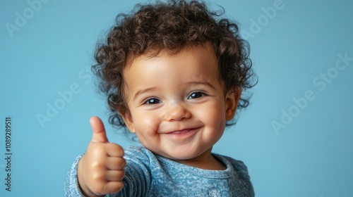 Cheerful baby with curly hair flashing a thumbs up smile while wearing a gray shirt against a soft light blue background
