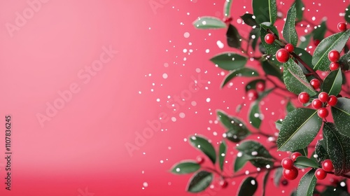 Cheerful banner with oversized holly details and falling snow, holiday deals theme, 3D illustration
