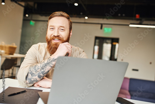 cheerful, bearded and tattooed entrepreneur with radiant smile looking at camera while sitting near laptop and working on startup project, professional headshot, business lifestyle concept