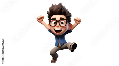 Cheerful cartoon boy wearing glasses joyfully jumps with excitement, showing victory