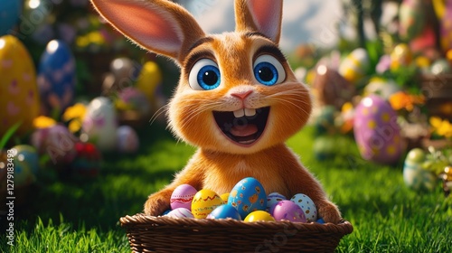Cheerful cartoon bunny with colorful easter eggs in sunny garden. Easter, Pascha, Paskha, Ostern, Pascua, Paques - Orthodox and Catholic Holiday celebration