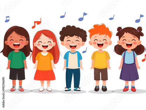 Cheerful children singing together, celebrating joy and friendship, with colorful notes enhancing the lively atmosphere.