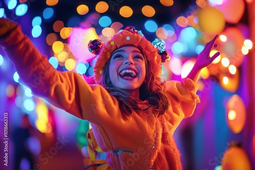 Cheerful costume party reveler enjoys vibrant Halloween lights and festivities