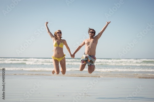 Cheerful couple holding hands while jumping at beach