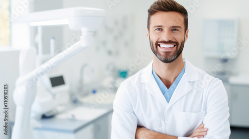 Cheerful dentist man wearing a lab coat standing in a dental clinic with a dental chair and equipment in the background.