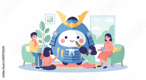 family, gathering, character, samurai, cute, blue, people, children, children, adult, adult, home, indoor, interior, room, living, furniture, sofa, armchair, floor, rug, mat, plant, potted, window, nature, sky, cloud, tree, painting, picture, frame, toy, game, play, fun, happy, joy, smiling, reading, book, tablet, interaction, bonding, togetherness, cartoon, illustration, flat