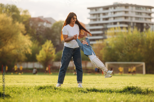 Cheerful, having fun, holding boy in hands. Mother and son are together on the summer field