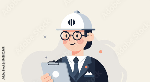 person, cartoon, illustration, character, male, man, professional, engineer, builder, architect, safety, helmet, hard hat, goggles, spectacle, round, cheerful, happy, smiling, holding, clipboard, document, paper, work, business, job, occupation, uniform, suit, attaching, formal, dark, blue, white, grey, cream, background, simple, modern, graphic, design, artistic, creative, clean, flat, vector, playful, friendly, smart