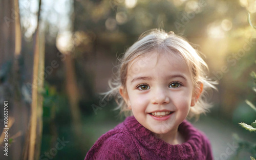 Cheerful little girl with sparkling eyes in a cozy sweater enjoying the beauty of nature during a sunny day, surrounded by greenery and a warm atmosphere.