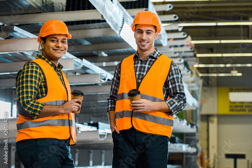cheerful multicultural workers holding paper cups and looking at camera