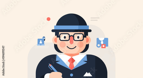 person, character, cartoon, illustration, business, professional, man, suit, attaching, hat, goggles, pen, writing, working, office, digital, technology, online, communication, meeting, strategy, datum, finance, career, success, achievement, goal, development, learning, growth, education, cognition, information, research, project, management, planning, organisation, task, deadline, presentation, report, document, creative, design, graphic, modern, simple