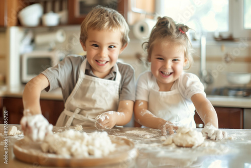 Cheerful preschool siblings, a boy and girl, in the kitchen with aprons, happily cooking and baking. Capturing the essence of family time, food preparation, and joyful moments betw