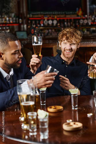 cheerful redhead man pointing at friend while having drinks after work in bar, interracial friends