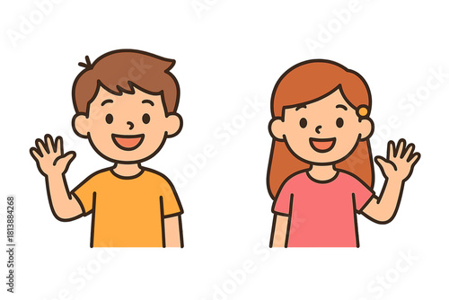 cheerful, young, boy, girl, waving, hand, friendly, welcoming, gesture, together, young boy, children, children, smiling, happy, greeting, hallo, adieu, cute, cartoon, character, avatar, childhood, youth, people, communication