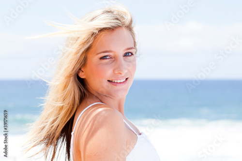woman, girl, young, beautiful, beauty, pretty, attractive, cute, cheerful, portrait, smile, adult, sea, ocean, view, face, head, head shot, copy space, copy space, outdoors, blond, blond, european, white, caucasian, lady, seascape, 1, person, single, blue, 20s, closeup, vitality, wellness, casual attire, leisure, summer, holiday, bright, carefree, free, dress, lifestyle, female