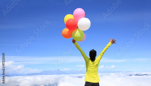 cheering young woman with colorful balloons on mountain peak