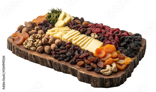 Cheese platter with assorted nuts and dried fruits, featuring various cheeses, walnuts, almonds, apricots, cranberries, and raisins, isolated on transparent background, png