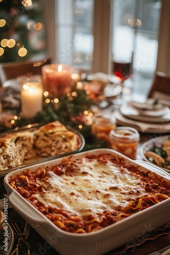 lasagna, pasta, cheese, meal, food, dinner, holiday, festive, christmas, winter, table, setting, candle, light, cosy, home, warmth, delicious, comfort, homemade, family, celebration, gathering, food photography, closeup