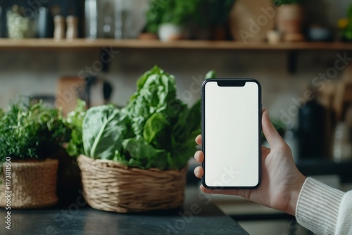 smartphone, blank screen, kitchen, vegetable, chef, cook, food, healthy, organic, fresh, template, technology, mobile, app, online, order, grocery, cooking, receipe, diet, nourishment, meal, ingredient, green, basket, home, domestic, lifestyle, hand, holding, display, white, copy space, vertical, indoor, blurred background, closeup