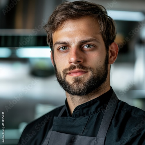 chef, kitchen, man, cook, portrait, food, professional, eatery, beard, apron, culinary, male, serious, indoor, uniform, young, caucasian, photogenic, cooking, confident, hospitality, closeup, industry