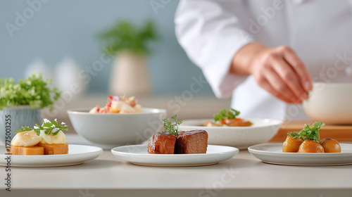 chef plating food, close-up hands, fine dining, fresh garnish, culinary art