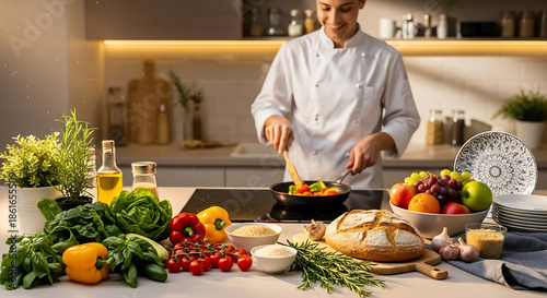 Chef preparing food in a modern kitchen with fresh ingredients.