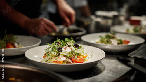 Chef Preparing Gourmet Vegan Dish in Professional Restaurant Kitchen