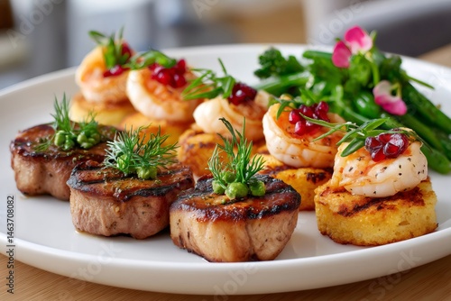 Chef preparing grilled shrimps with polenta and grilled meat with dill and peas